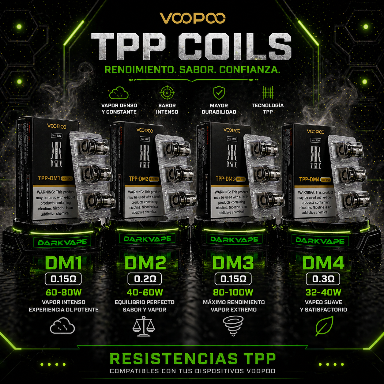 Estos rangos coinciden con las especificaciones publicadas por VOOPOO para la línea TPP Coils.